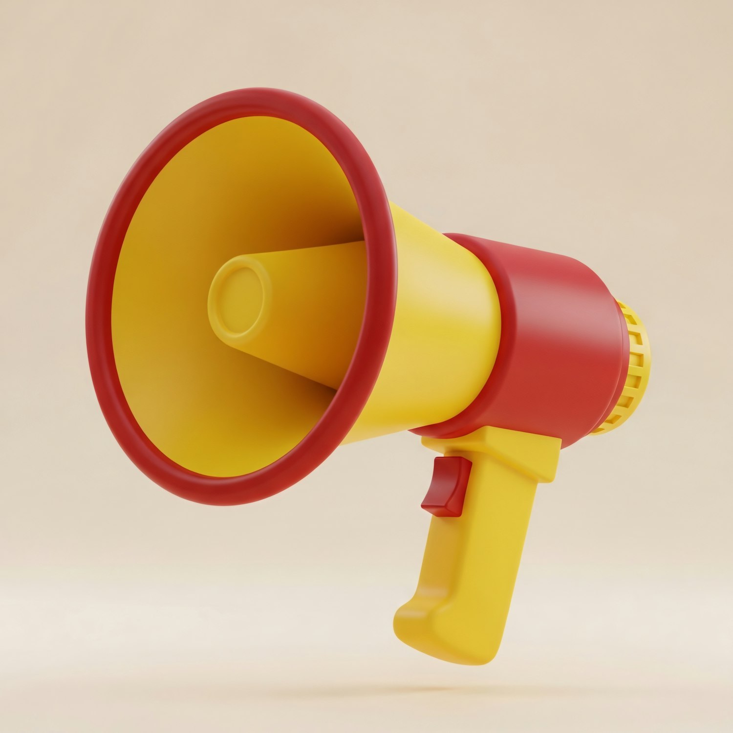 Bright 3D-rendered megaphone in yellow and red tones, isolated on a beige background, showcasing a clean and modern design.
