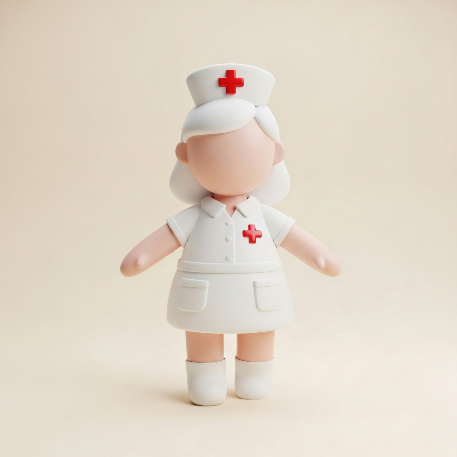 A minimalist 3D nurse figure in a white uniform with a red cross, set against a neutral background, symbolizing healthcare and compassion.