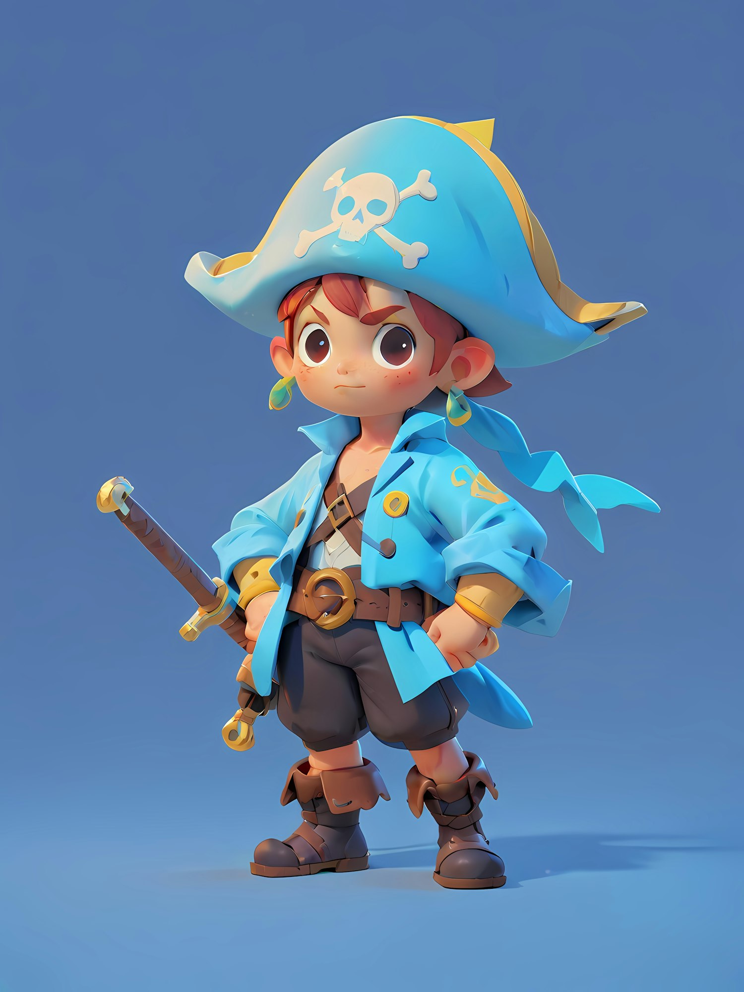Adorable 3D pirate character with a blue hat, gold accents, and a sword, ready for adventure in a playful cartoon style.
