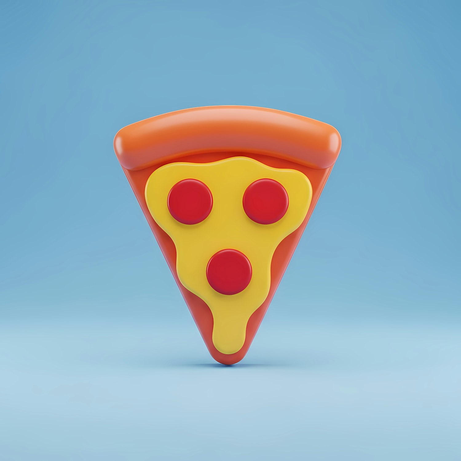Bright and fun 3D pizza slice illustration with orange crust, yellow cheese, and red pepperoni on a light blue background.