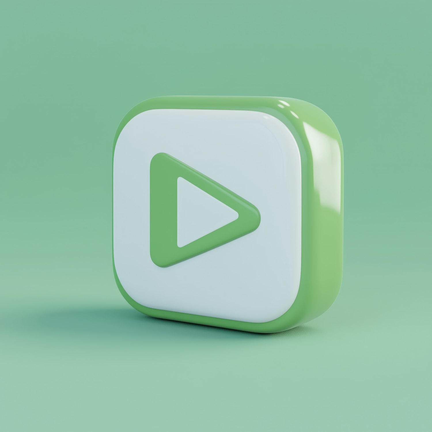 3D-rendered play button icon with a glossy white face and green accents, set against a solid green background. Modern and minimalistic.