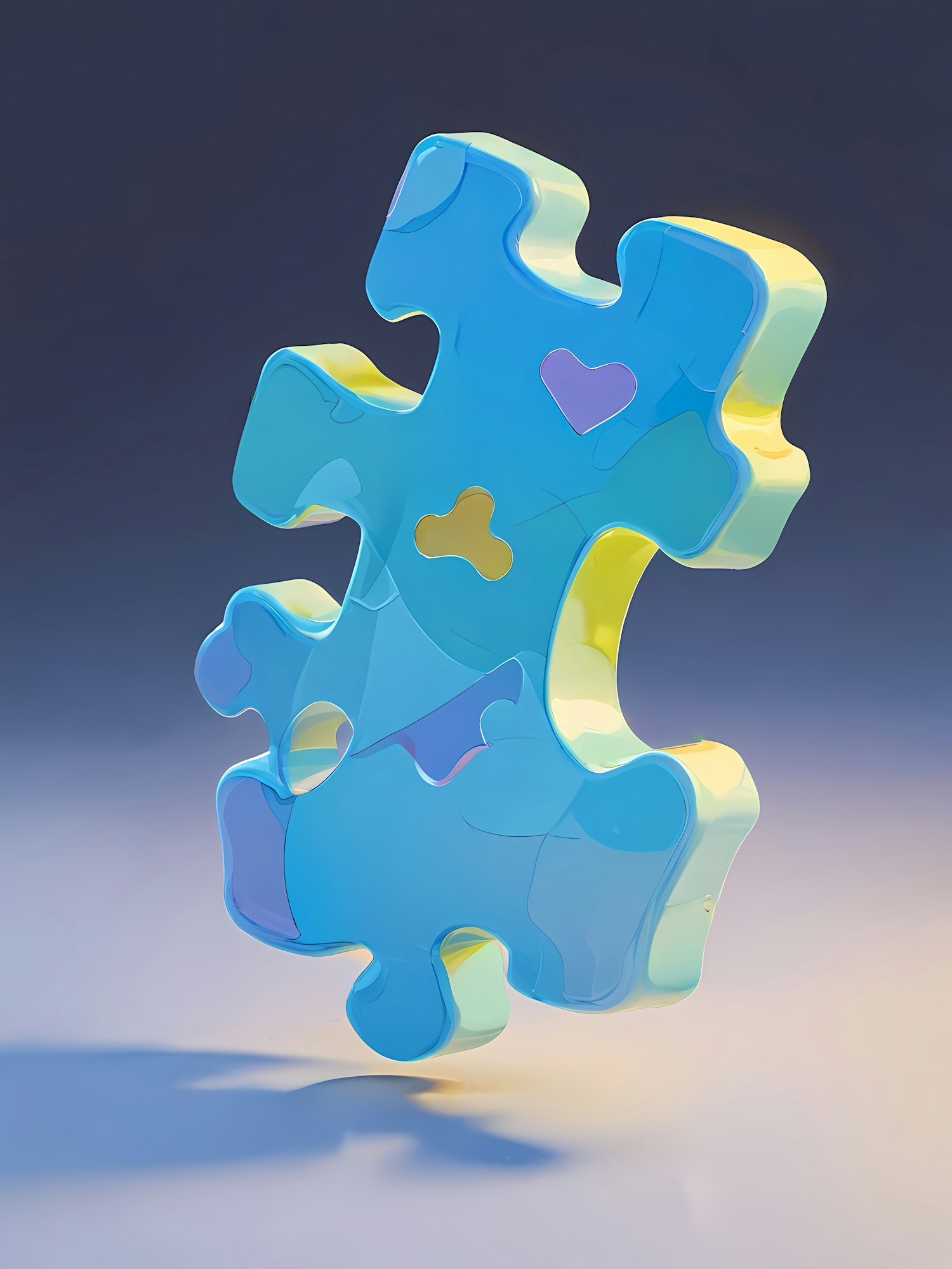 A glossy blue 3D puzzle piece with heart and abstract shapes floats against a gradient background, creating a playful and modern vibe.