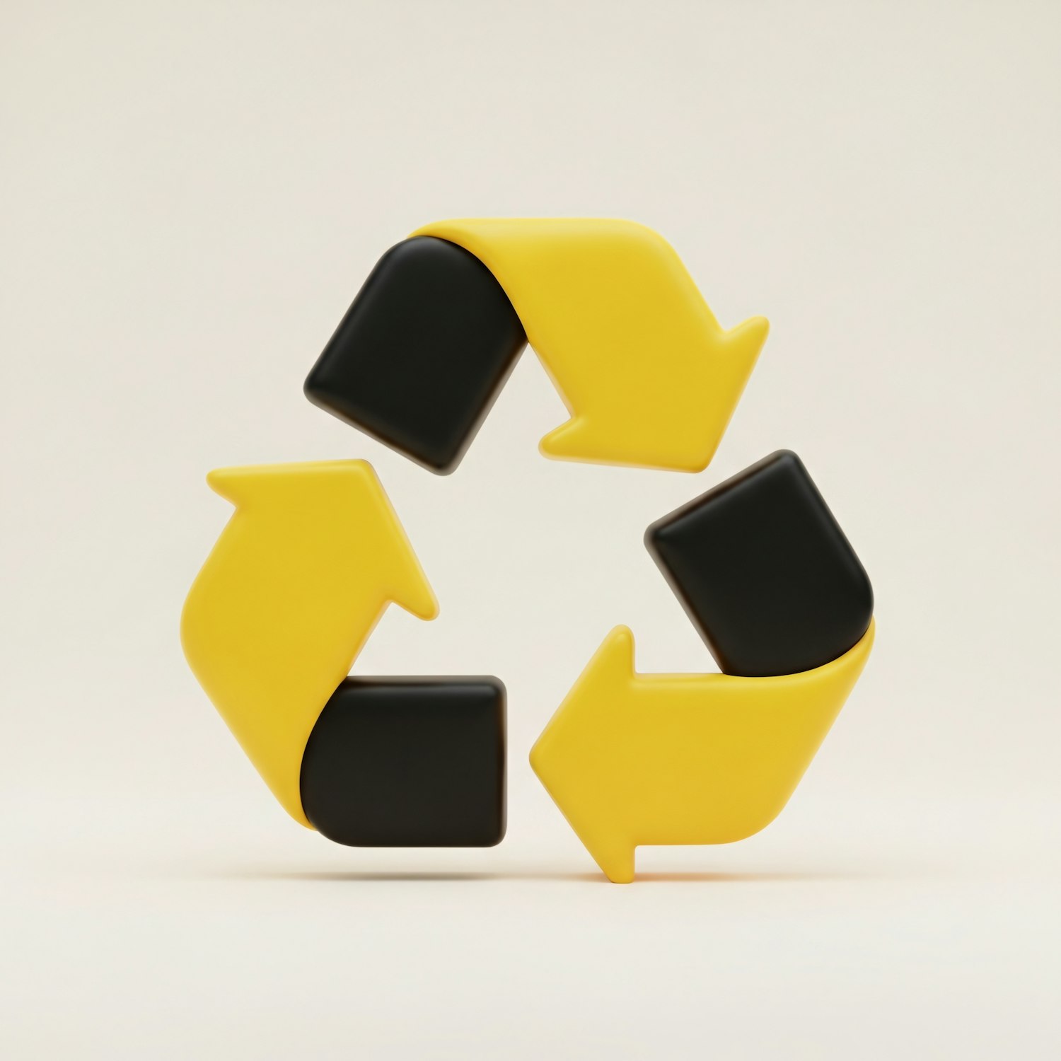 3D recycling symbol with yellow and black arrows on a neutral background, symbolizing sustainability and environmental awareness.