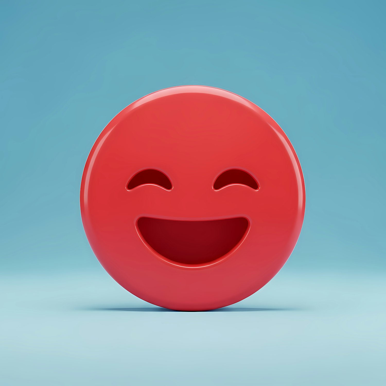 Bright red 3D smiley face emoji with a cheerful expression on a light blue background. Perfect for conveying happiness and positivity.