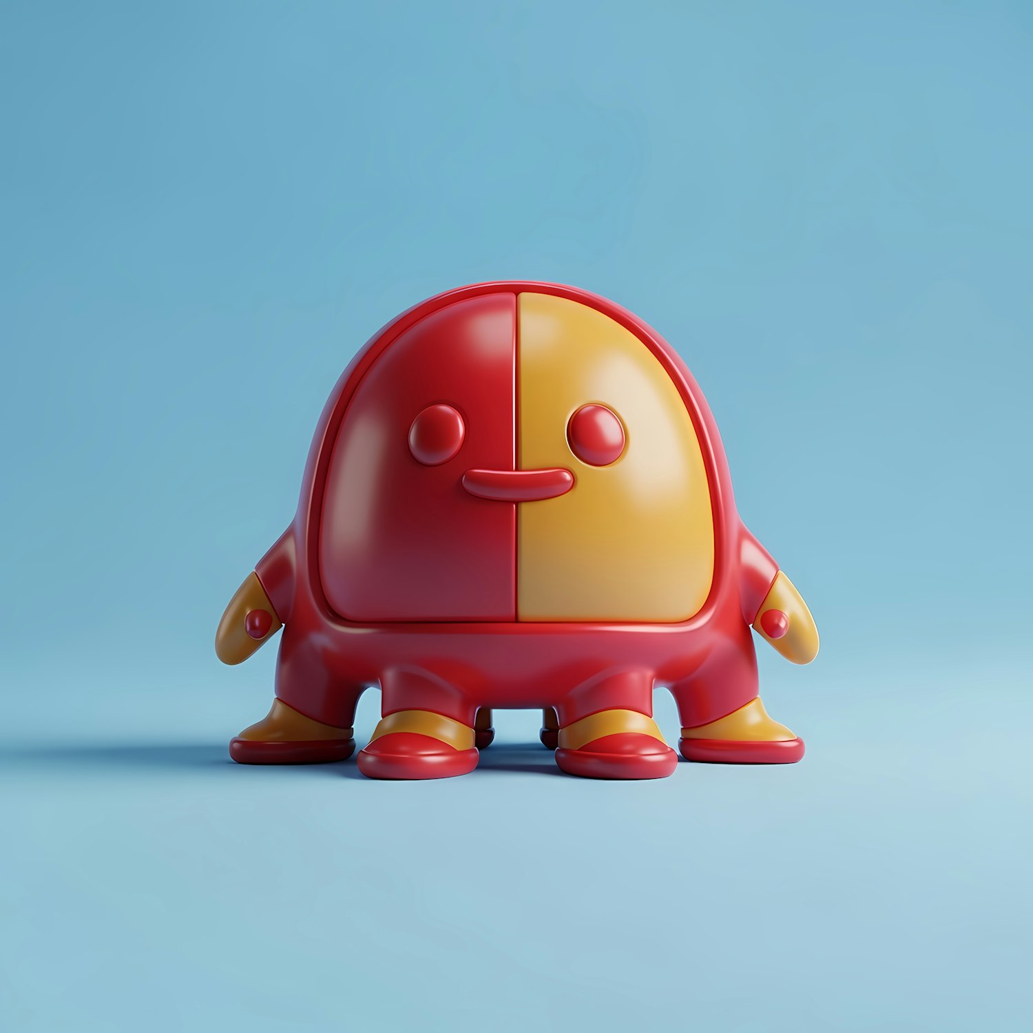 A cute 3D-rendered character with a red and yellow design, standing on a light blue background. Perfect for toy or design inspiration.