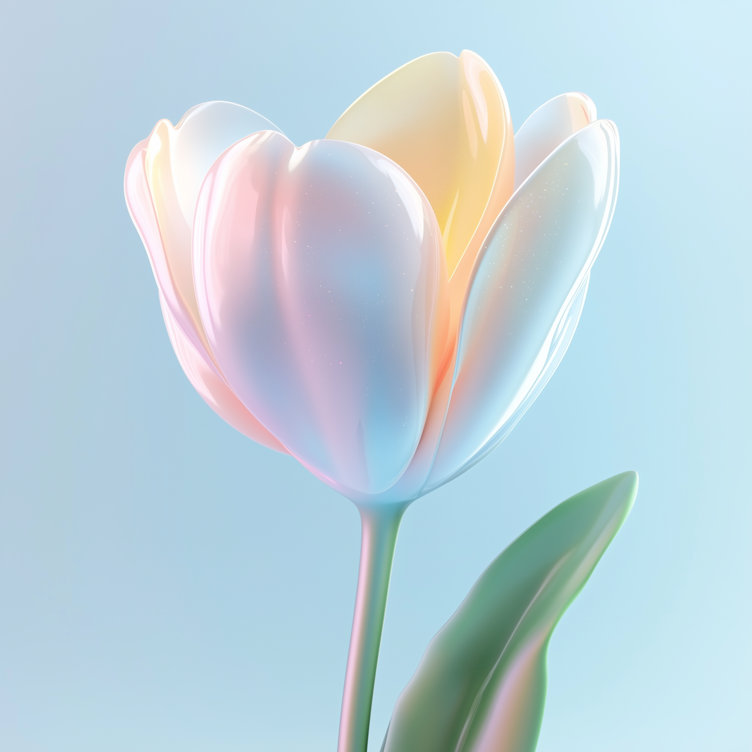 A glossy 3D tulip with pastel petals in pink, blue, and yellow hues, set against a soft blue background. Perfect for a serene aesthetic.
