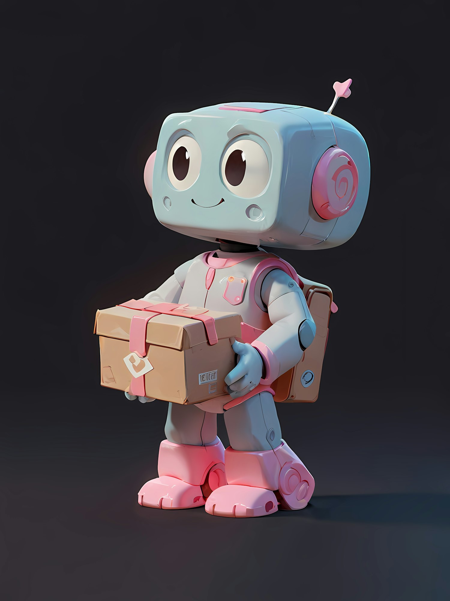 Adorable pastel-colored robot holding a gift box with a pink ribbon, perfect for delivery or gift-giving themes.