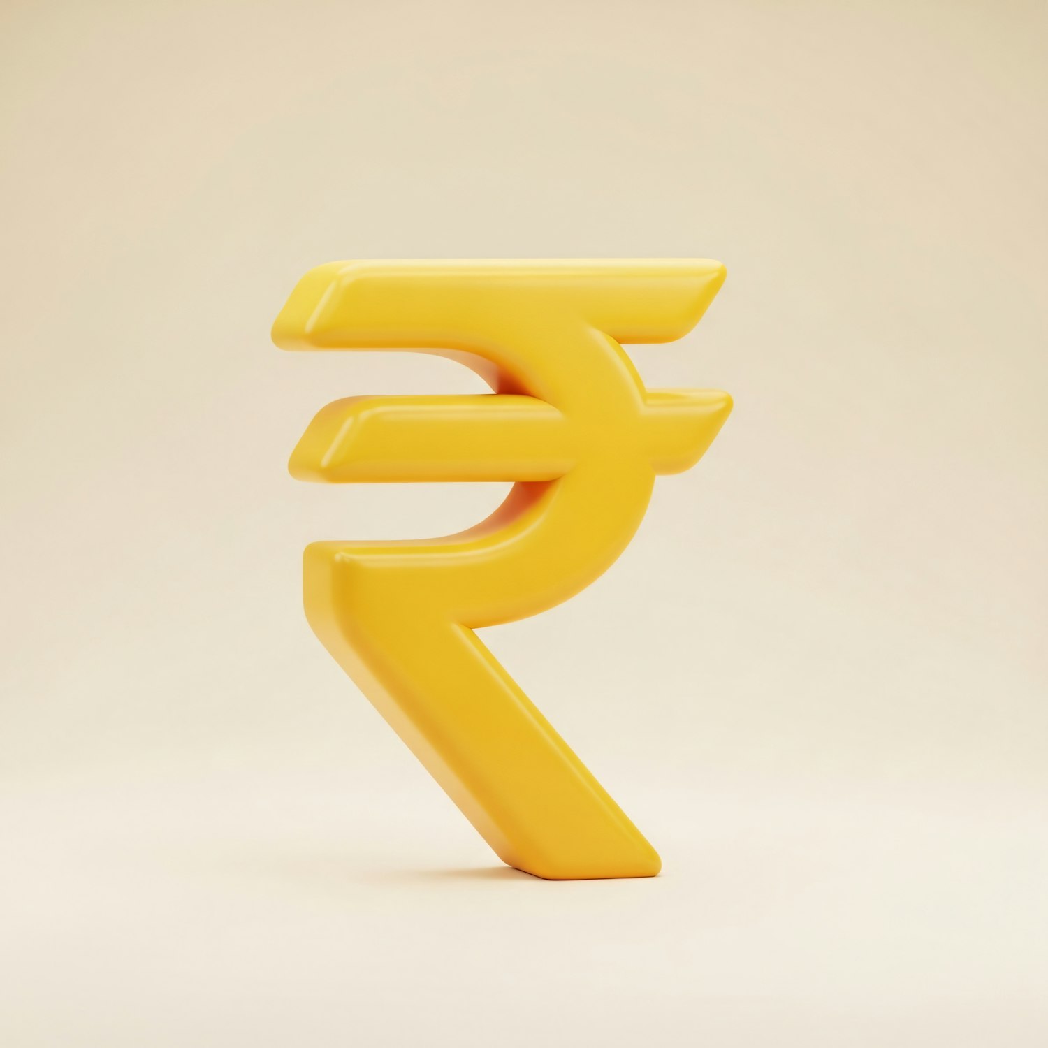 A vibrant 3D yellow Indian Rupee symbol on a soft beige background, showcasing a modern and clean design.