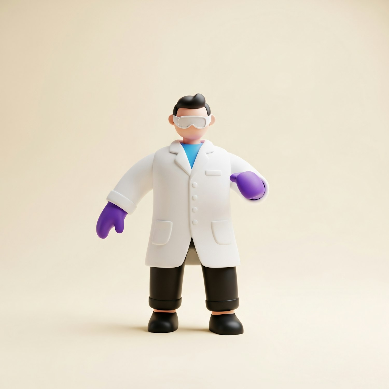 A 3D illustration of a scientist in a lab coat with goggles and gloves, set against a neutral background.