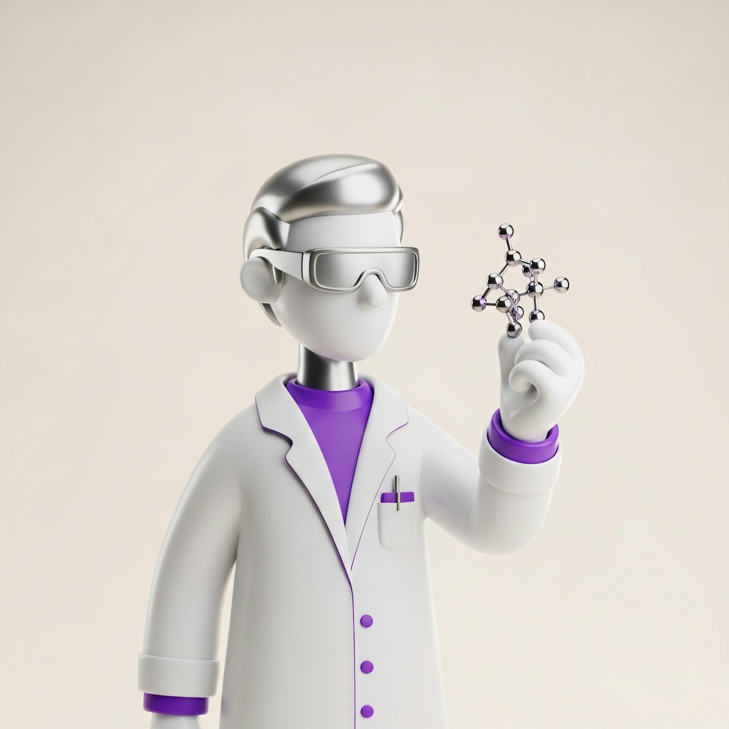 3D illustration of a scientist holding a molecular model, wearing a white lab coat with purple accents and protective goggles.