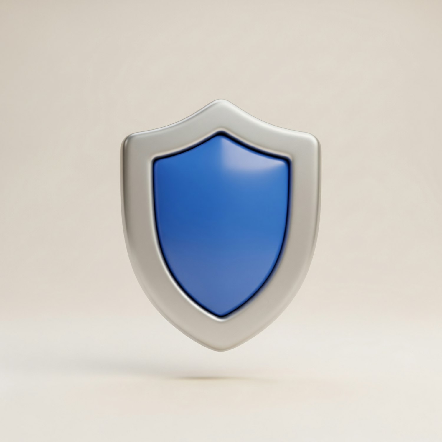A sleek 3D-rendered shield icon with a silver border and blue center, symbolizing protection and security.