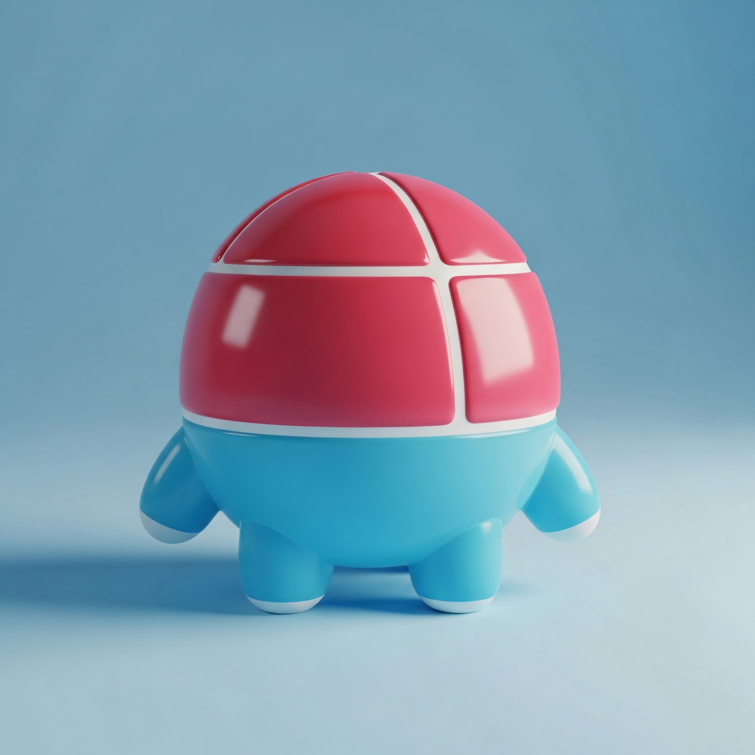 A vibrant 3D character with a red and blue segmented body, glossy finish, and a playful design against a light blue background.