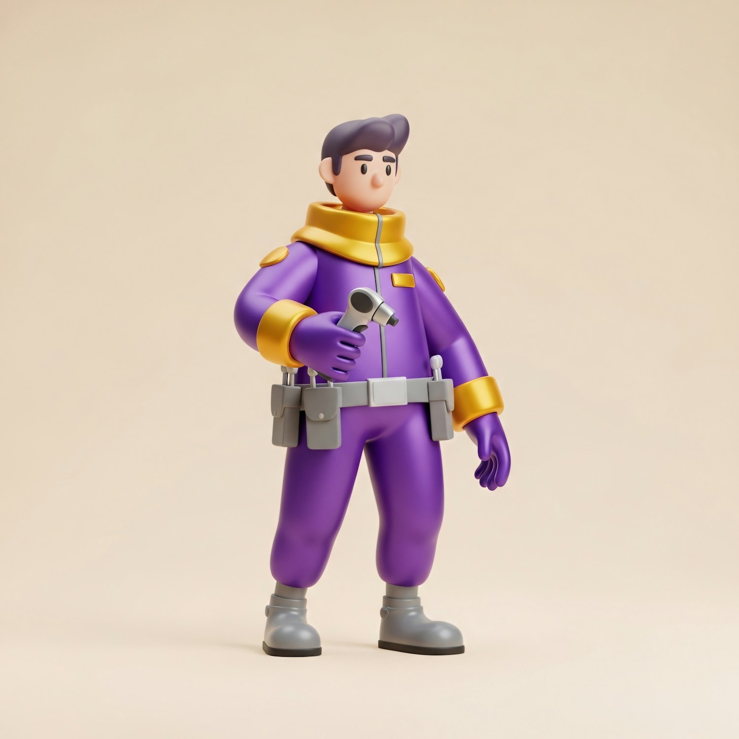 A 3D-rendered character in a purple and yellow jumpsuit holding a tool, showcasing a modern and stylized design.
