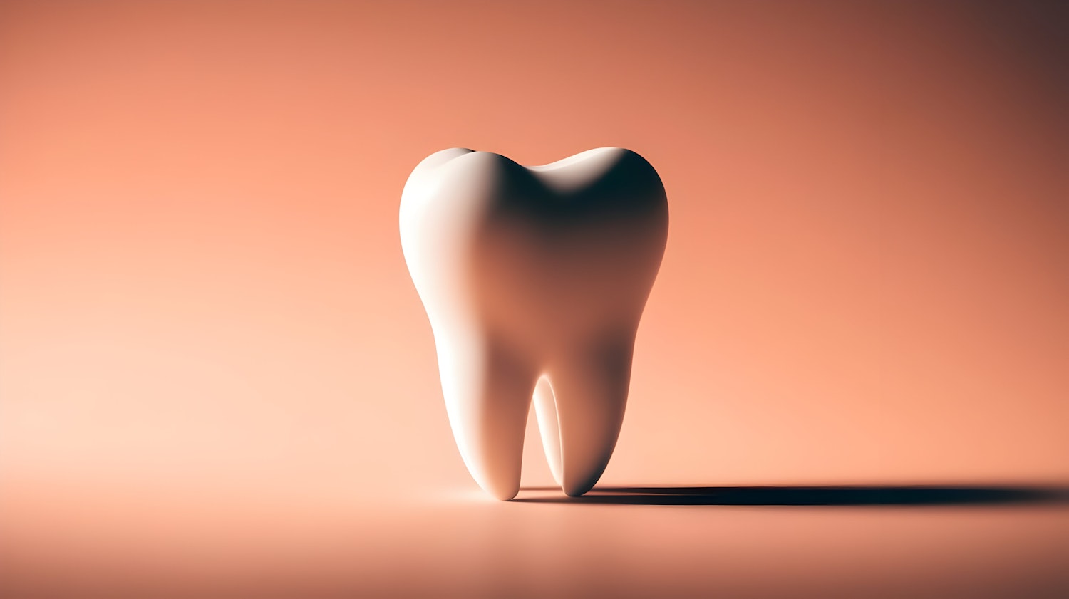 A realistic 3D rendering of a tooth on a peach gradient background, showcasing smooth contours and soft lighting for a clean, minimal look.