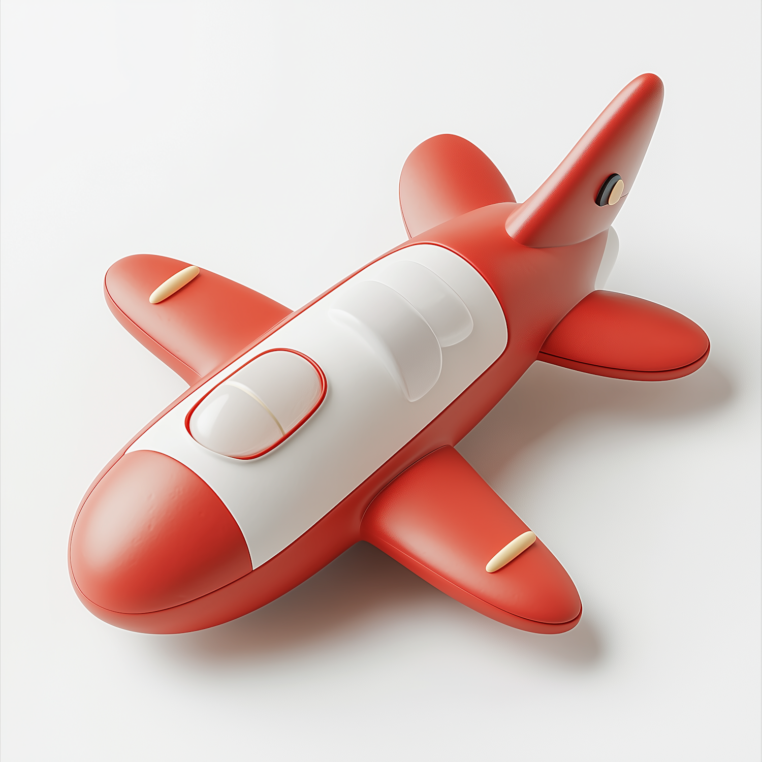 A vibrant red and white 3D toy airplane with a smooth, glossy finish and child-friendly rounded design on a plain white background.