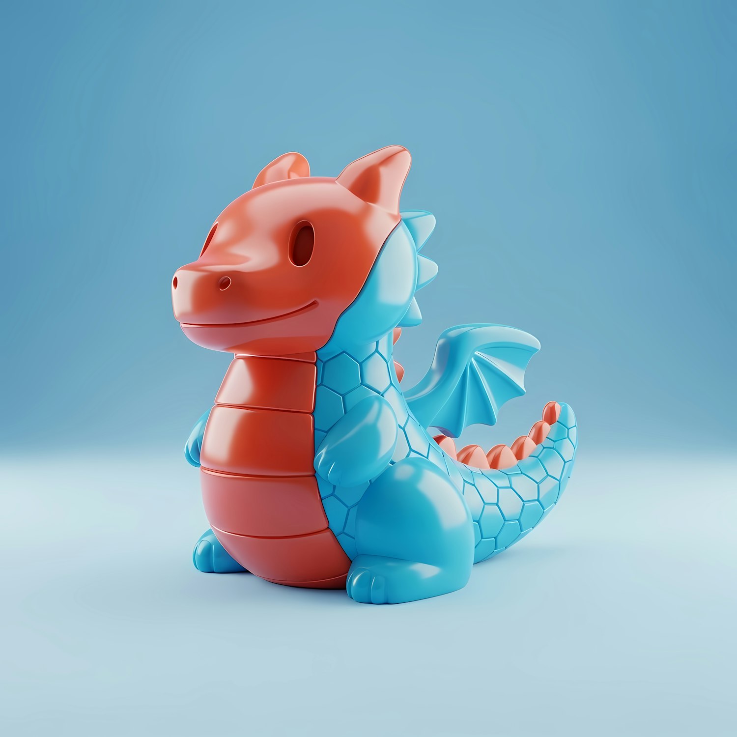 Adorable 3D-rendered dragon toy with red and blue colors, featuring a hexagonal pattern and a cheerful design on a light blue background.