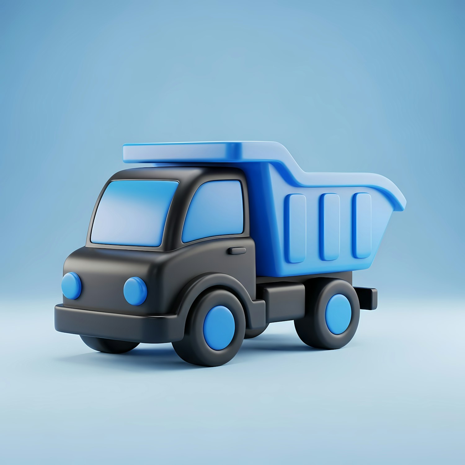 Cute 3D toy dump truck with a black cab and blue dump bed, perfect for kids' designs or playful themes.