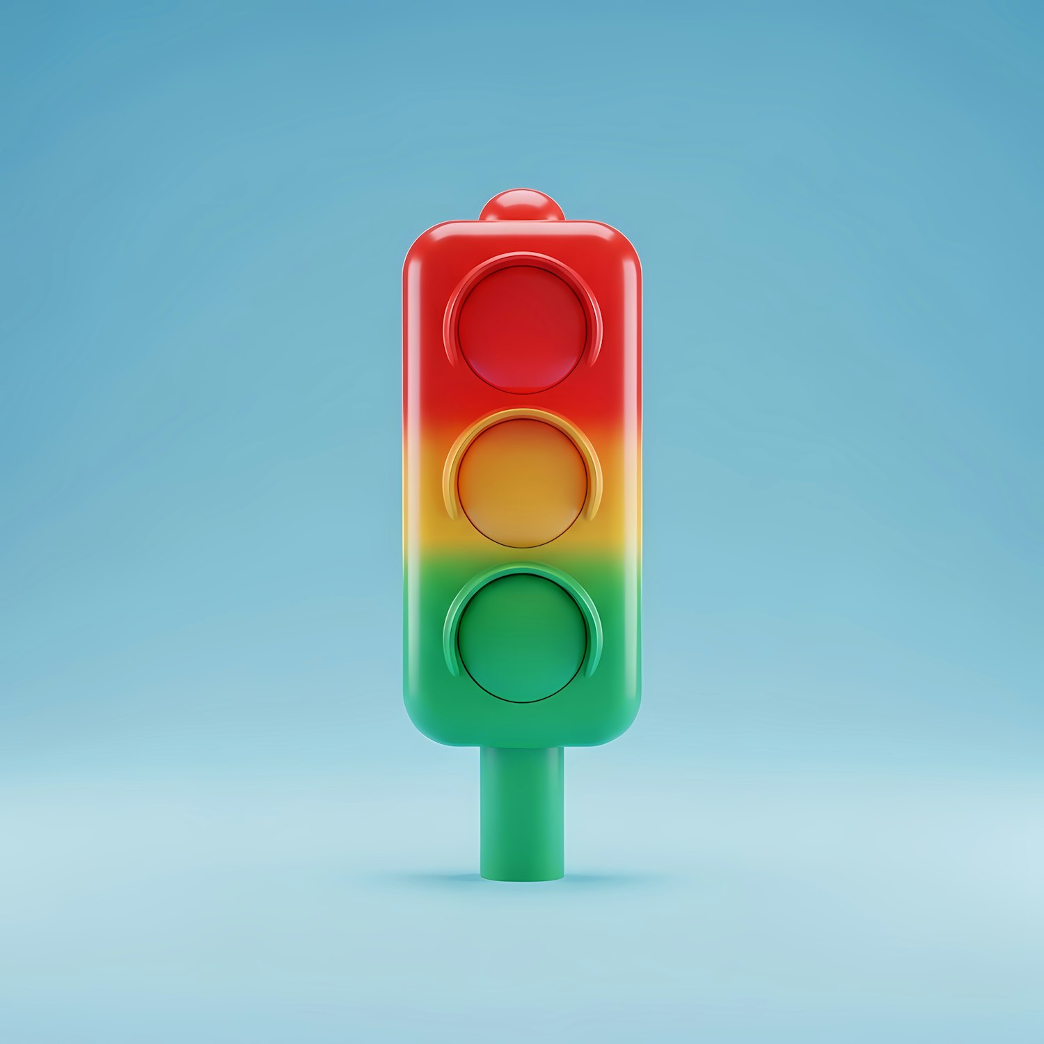 A vibrant 3D traffic light design with red, yellow, and green colors, set against a clean blue background. Perfect for creative projects.