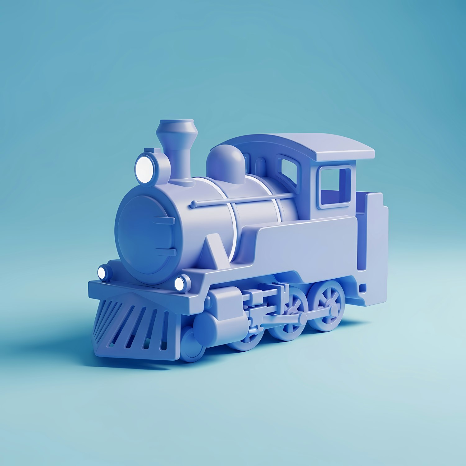 A sleek 3D-rendered blue steam locomotive on a gradient blue background, showcasing intricate details and a minimalist design.