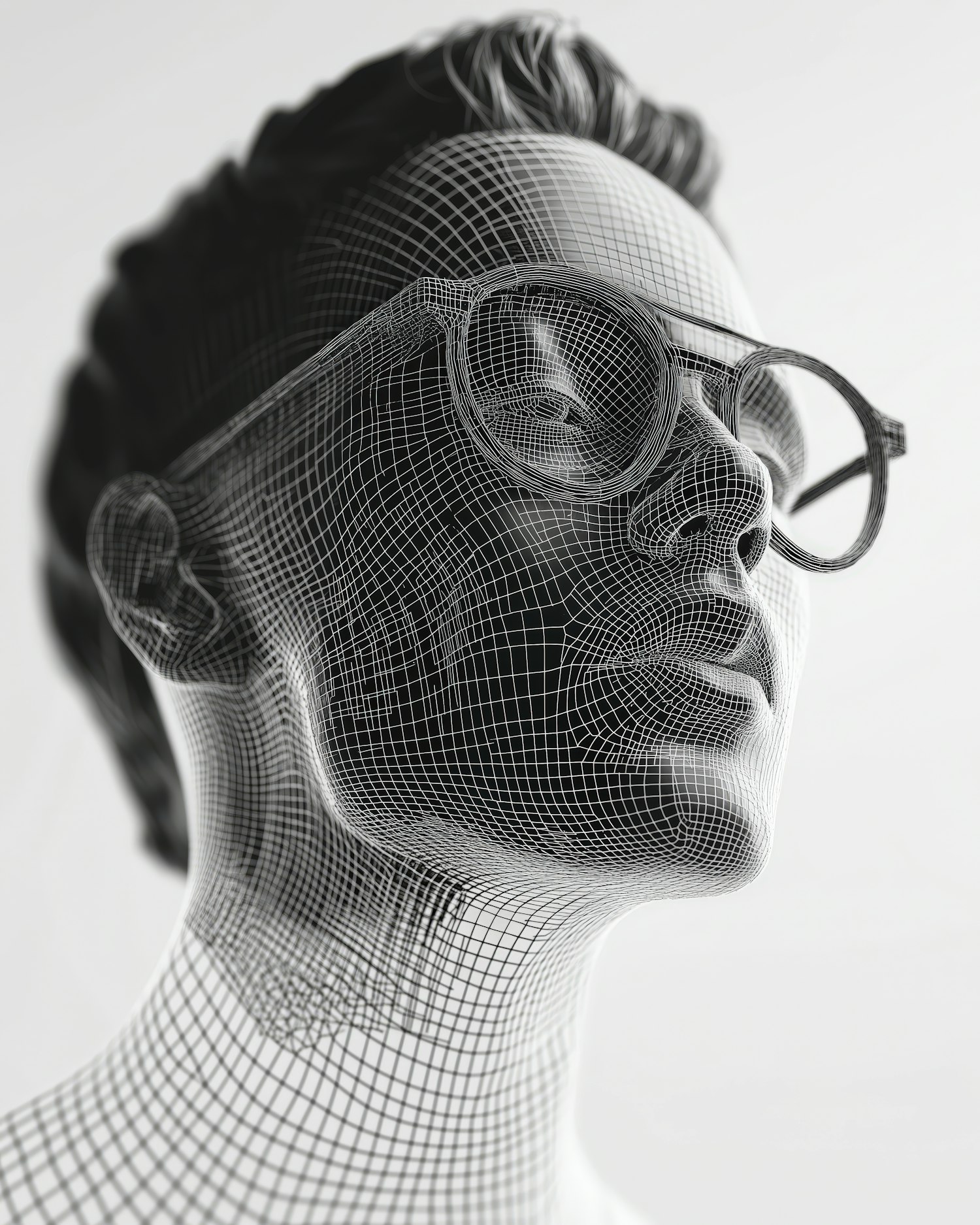 Intricate 3D wireframe of a human head with glasses, showcasing detailed contours and a monochromatic black-and-white design.