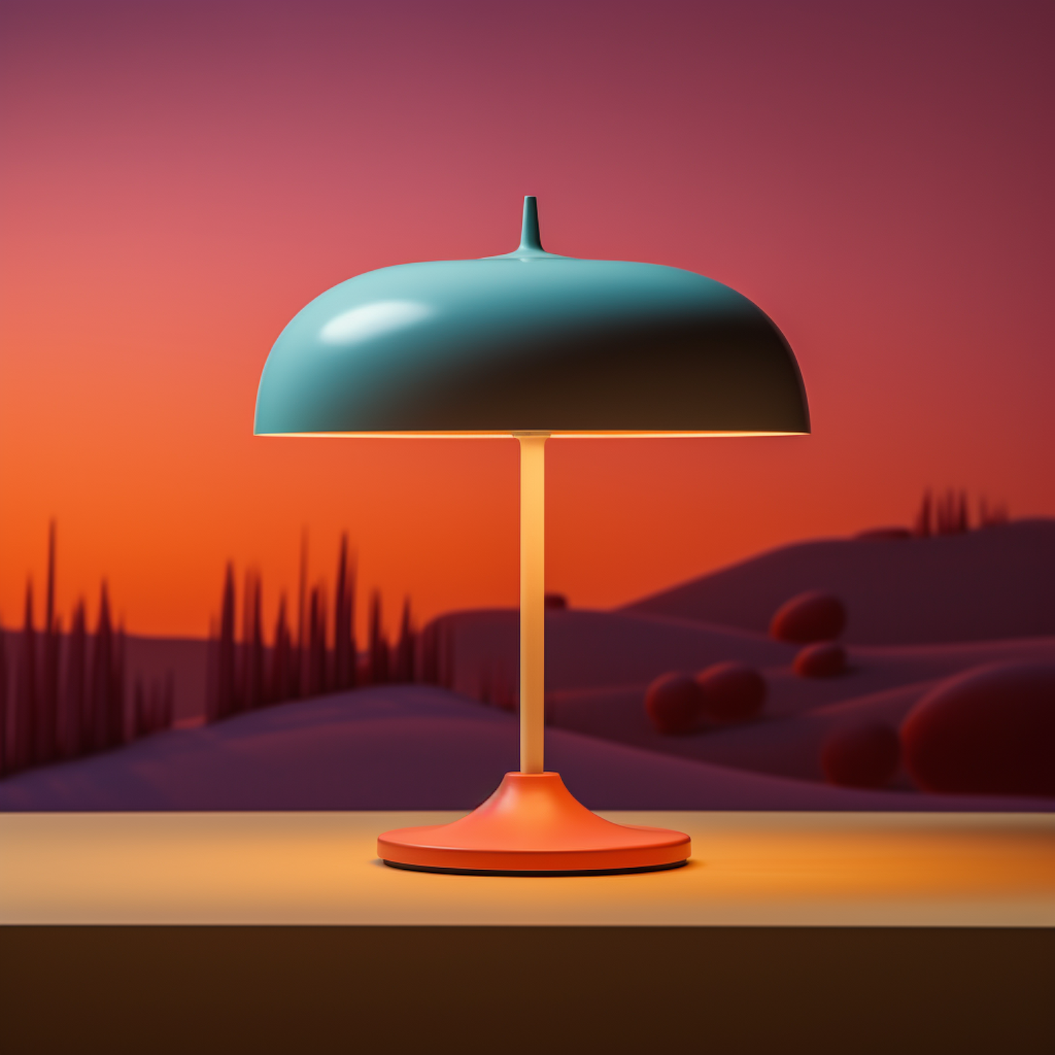 Modern teal and orange table lamp against a stylized sunset landscape, blending elegance with vibrant colors.