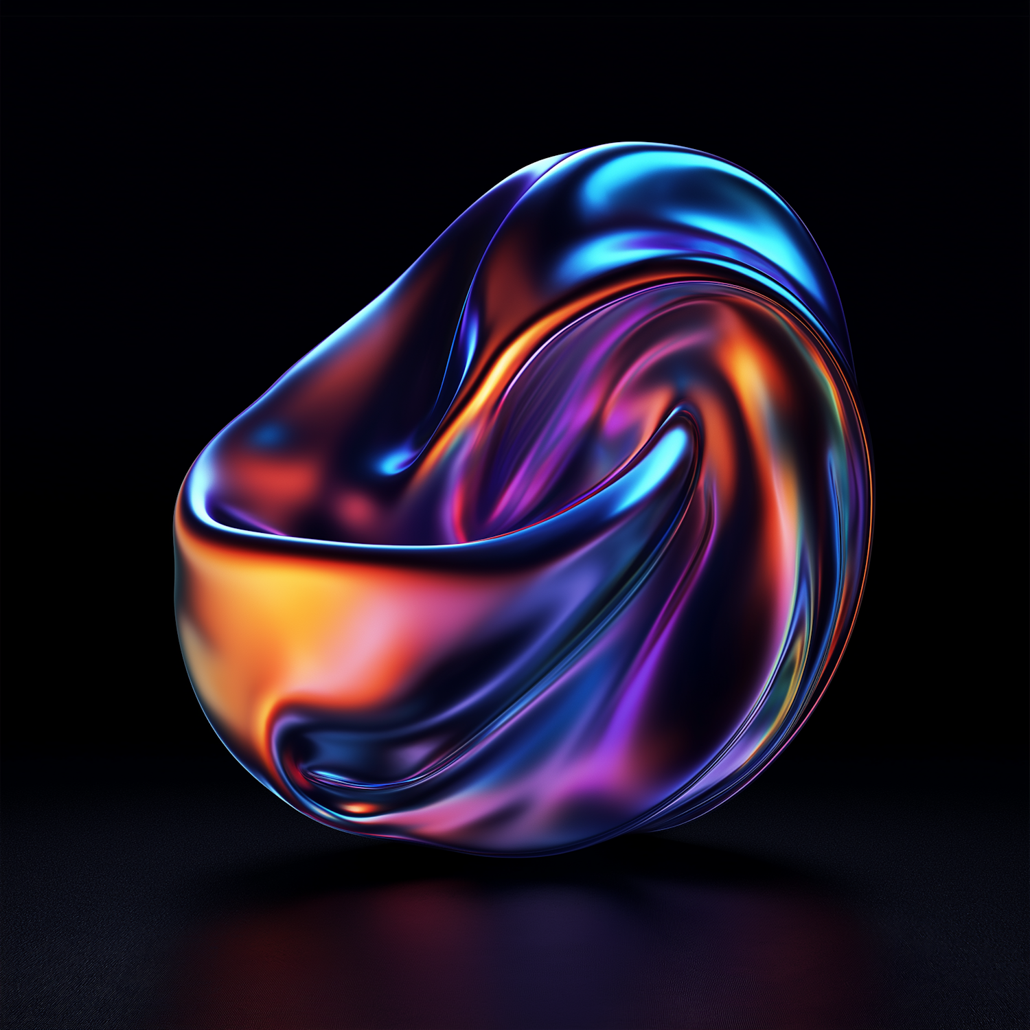 A vibrant 3D abstract shape with swirling metallic colors like blue, orange, and purple, glowing against a black background.