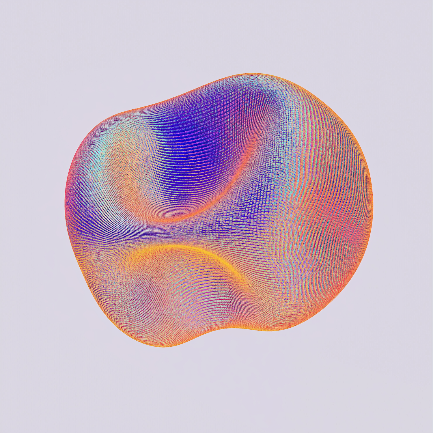 A colorful abstract 3D shape with gradient hues of blue, purple, orange, and yellow, floating against a light gray background.