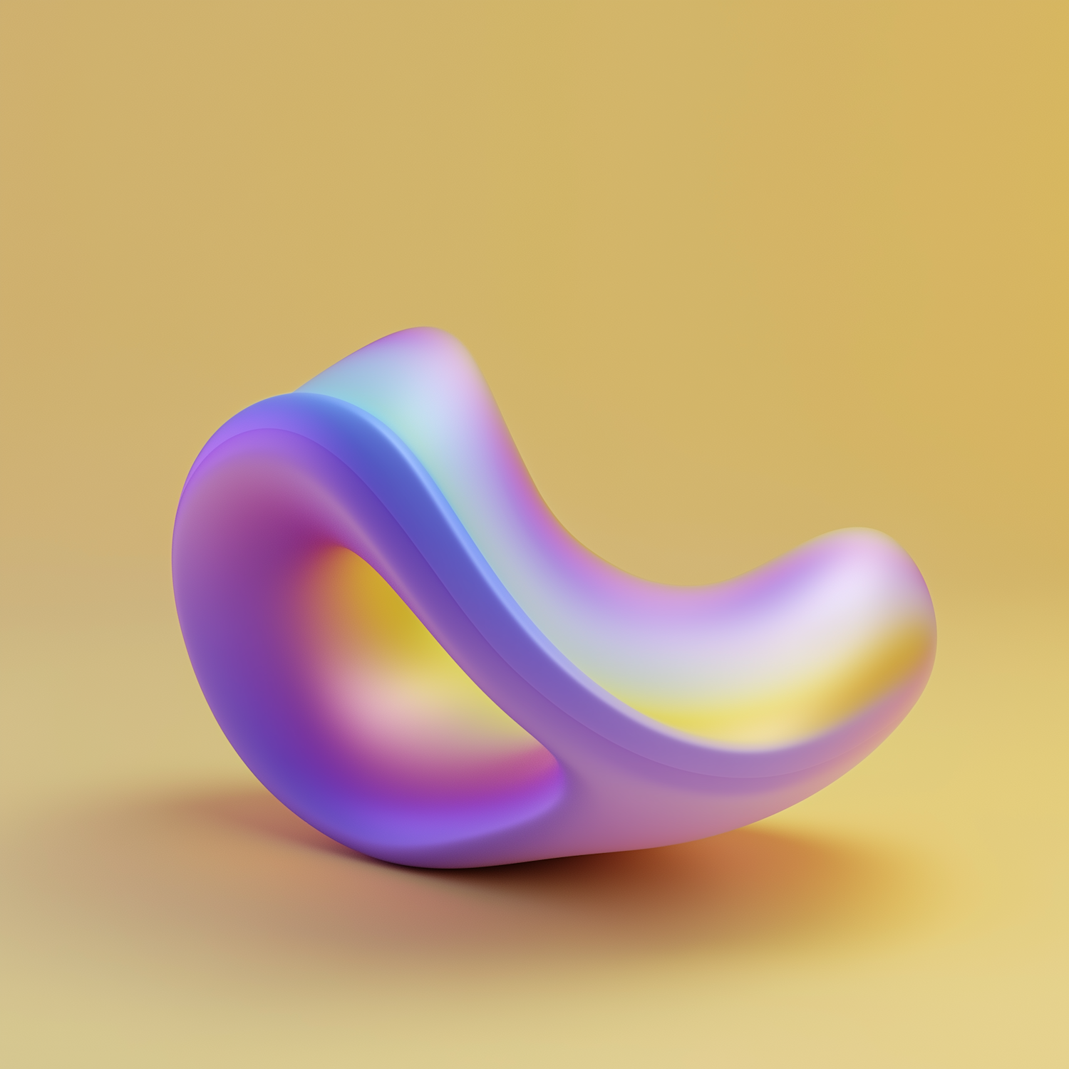 A colorful abstract 3D sculpture with a wave-like shape and pastel gradient hues, set against a plain yellow background.