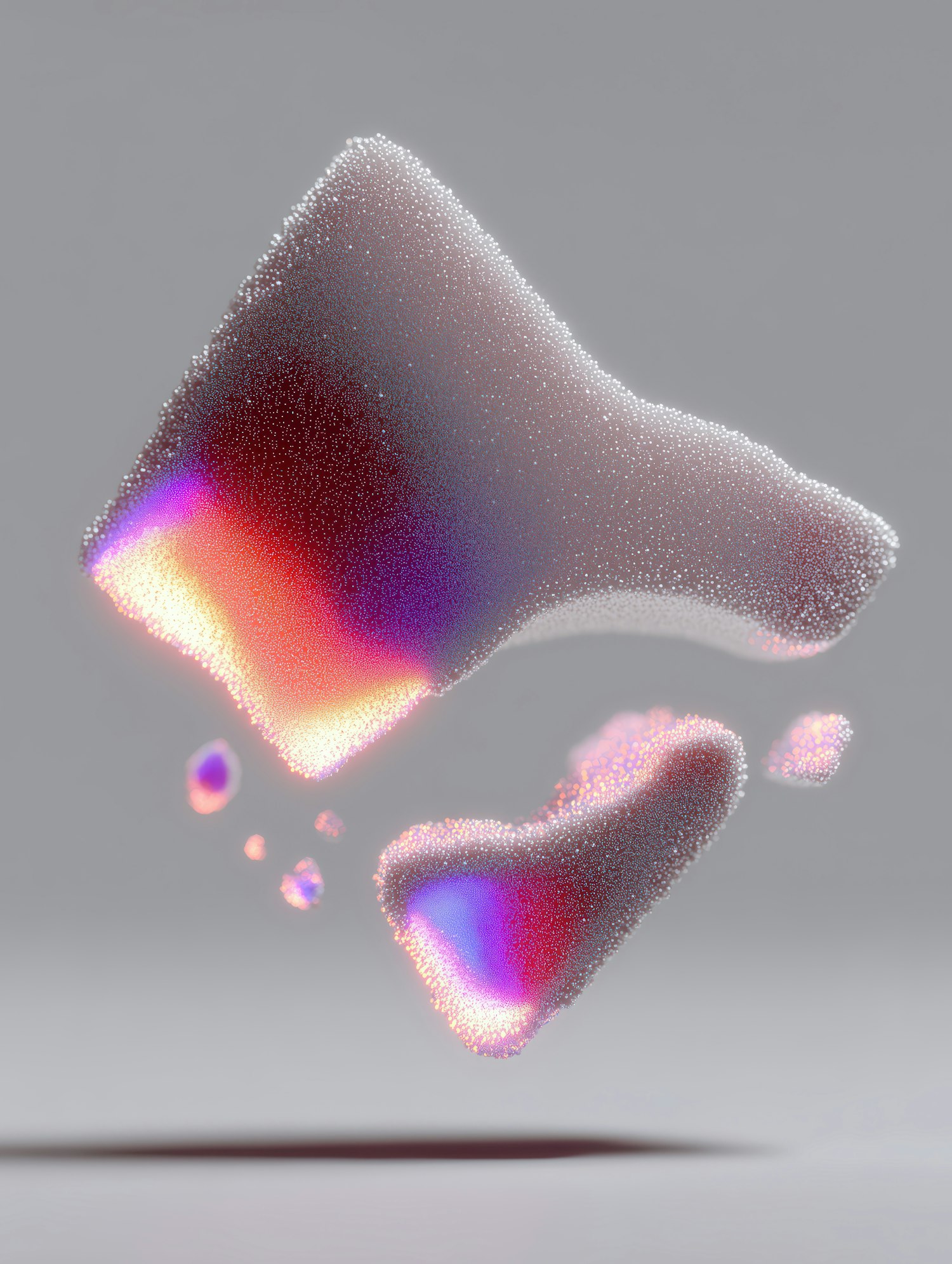 Abstract 3D art with glowing, particle-based shapes in vibrant colors on a neutral gray background. Modern and visually captivating.