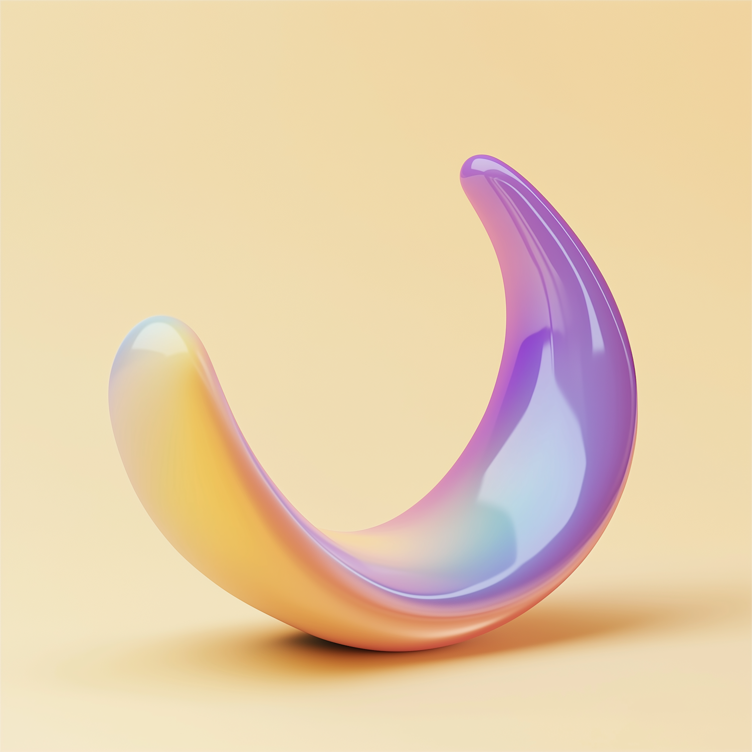 A glossy, gradient 3D crescent sculpture with vibrant hues of yellow, orange, purple, and blue on a pastel yellow background.