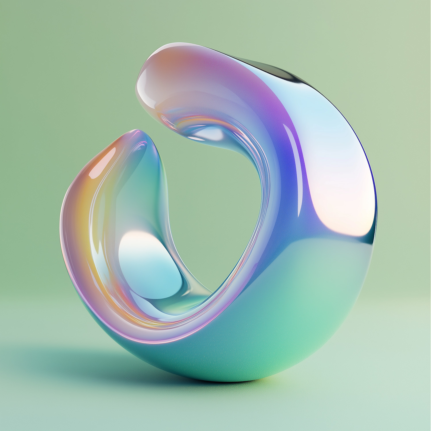 A glossy, iridescent 3D sculpture with a fluid loop design, set against a pastel green background. Perfect for modern art lovers.