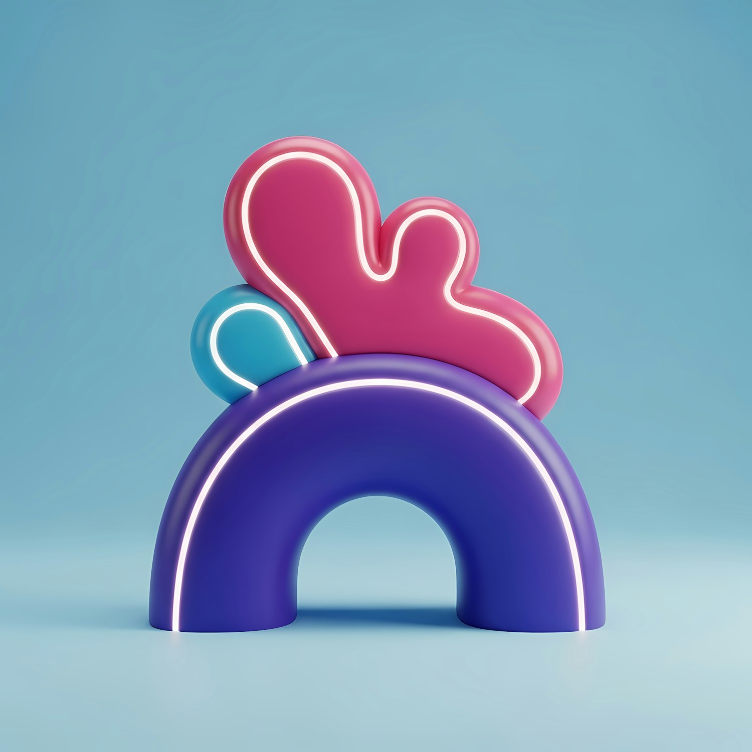 A colorful 3D abstract sculpture with glowing outlines, featuring a purple arch and pink and blue organic shapes on a blue background.
