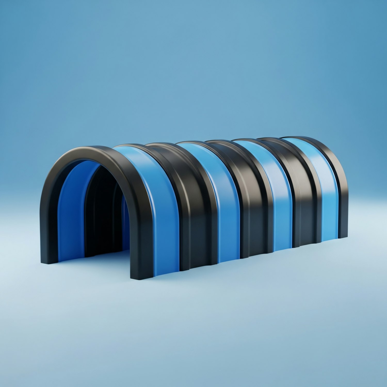 A sleek, modern structure with alternating blue and black arches on a light blue background, showcasing minimalistic and abstract design.