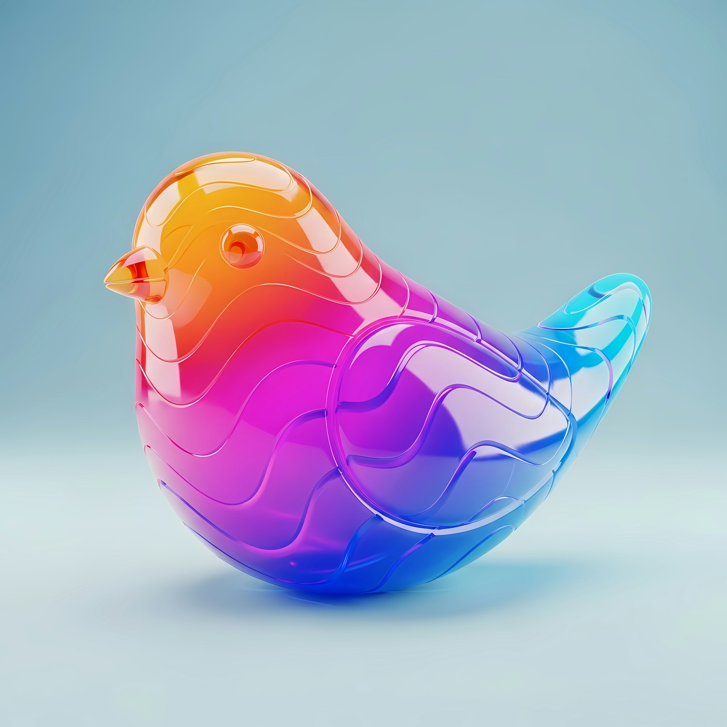 A colorful 3D-rendered bird sculpture with a glossy finish, featuring a gradient of orange, purple, and blue hues on a light blue background.