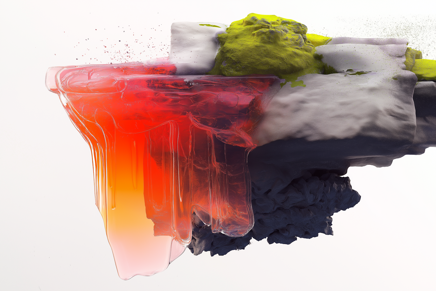 Abstract art with vibrant red and orange glass-like textures, contrasting with mossy green and dark rugged surfaces.