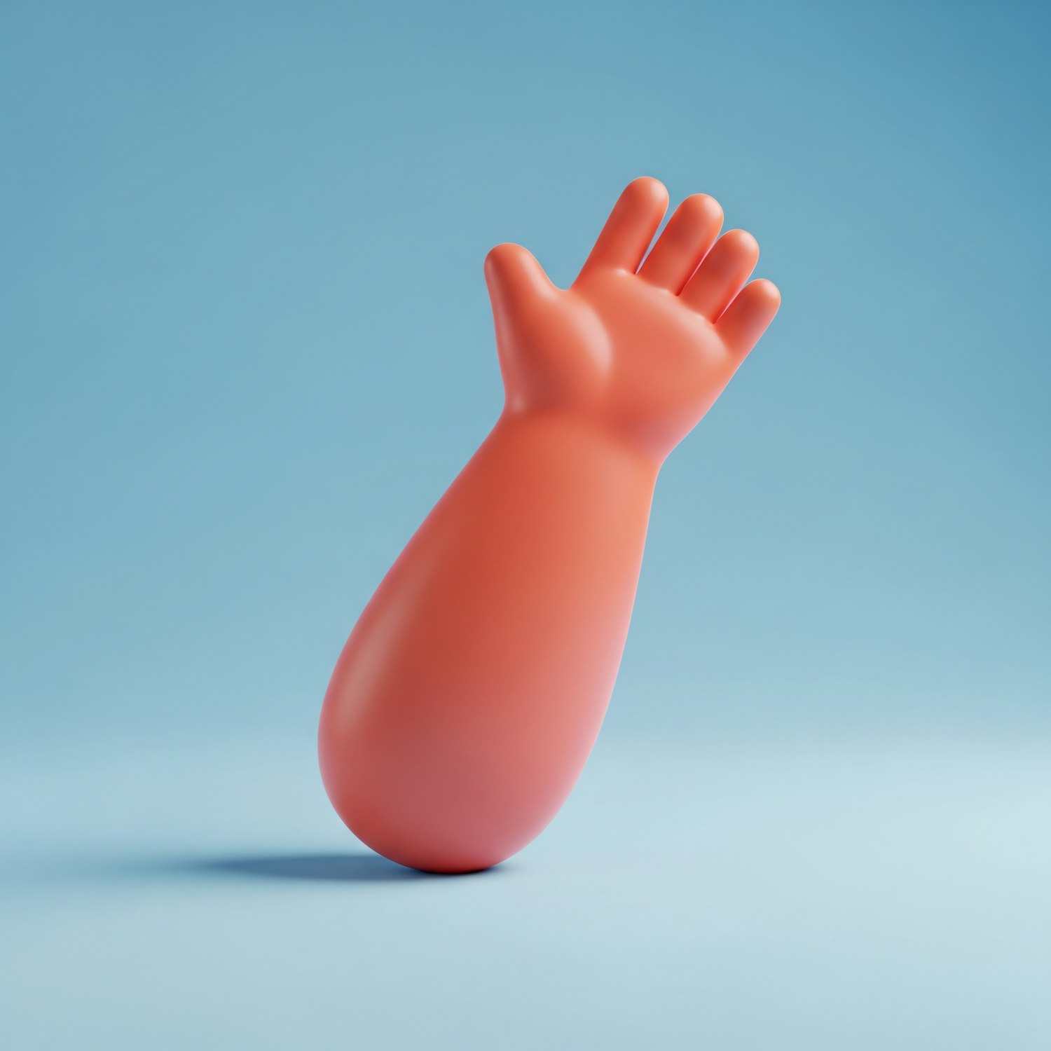 A 3D-rendered coral-colored hand-like object on a gradient blue background, showcasing smooth textures and a playful design.
