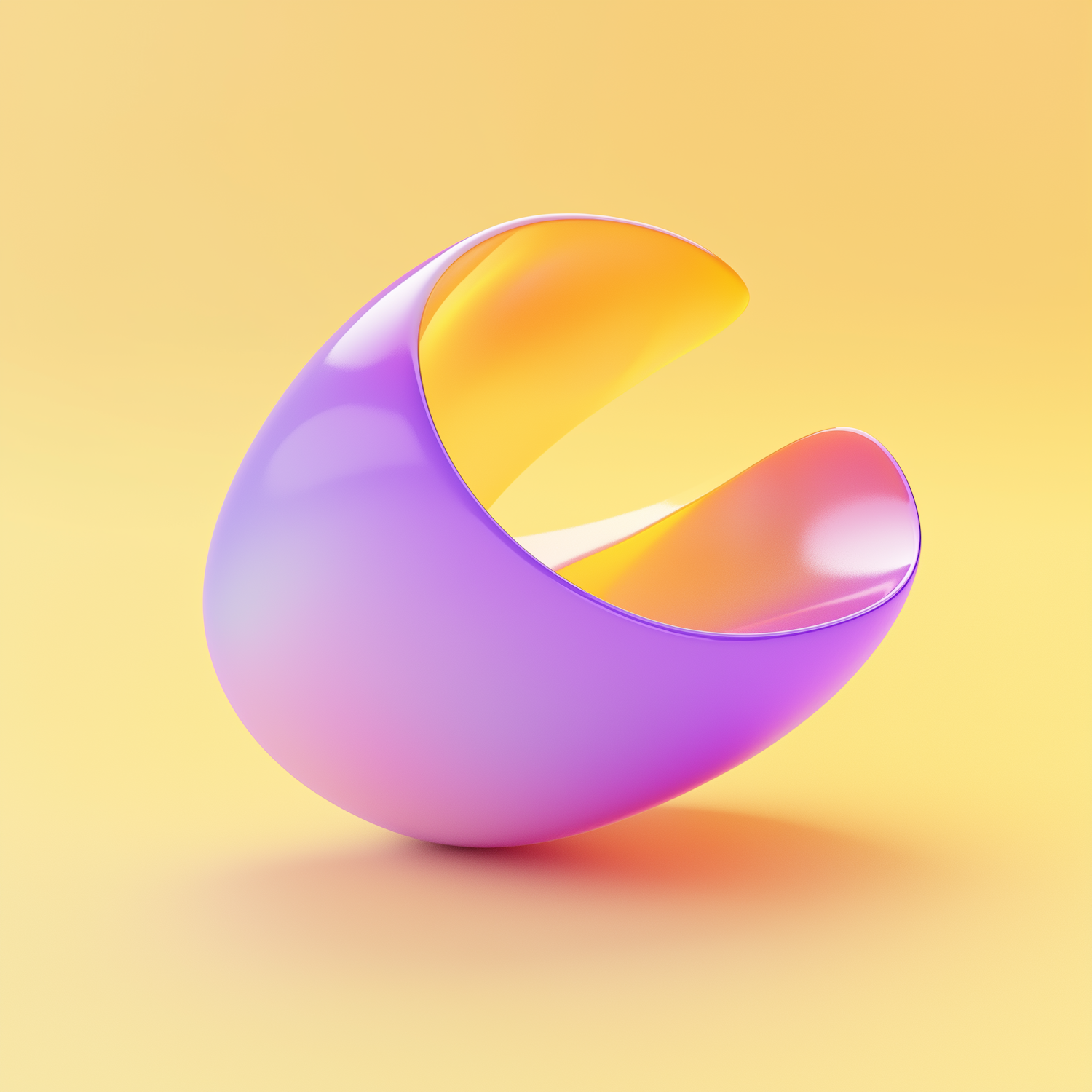 A modern 3D abstract crescent with purple and yellow-orange gradients on a soft yellow background, showcasing smooth curves and glossy textures.