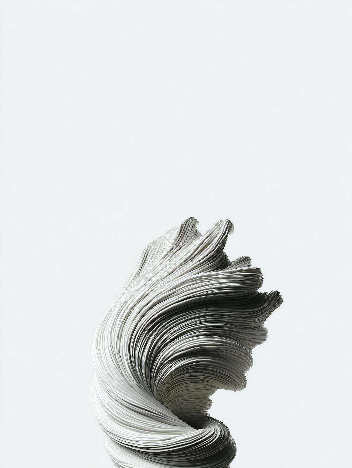 Abstract digital art of a flowing, ribbon-like structure in white and gray tones, showcasing dynamic motion and intricate texture.