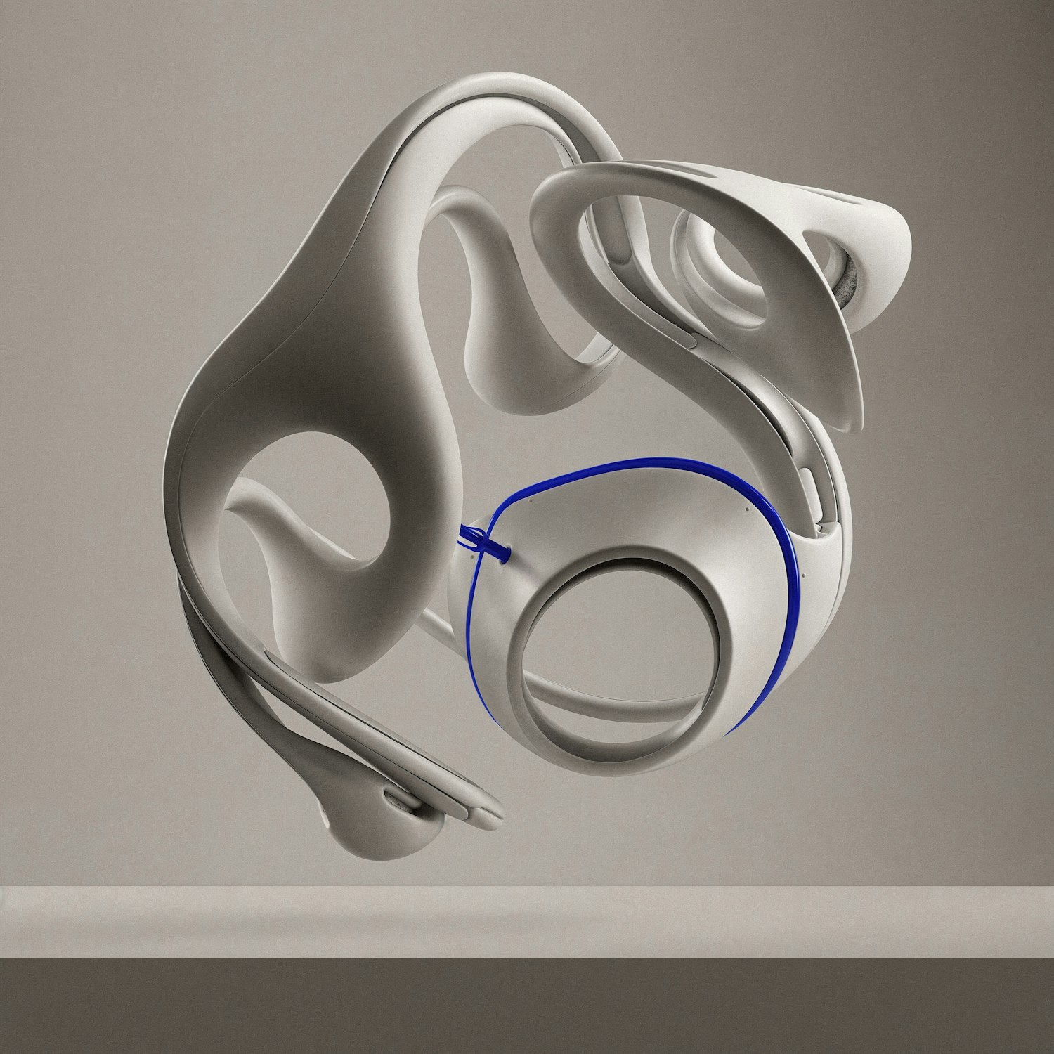 Abstract white sculpture with flowing curves and blue accents, suspended against a neutral background, showcasing modern design.