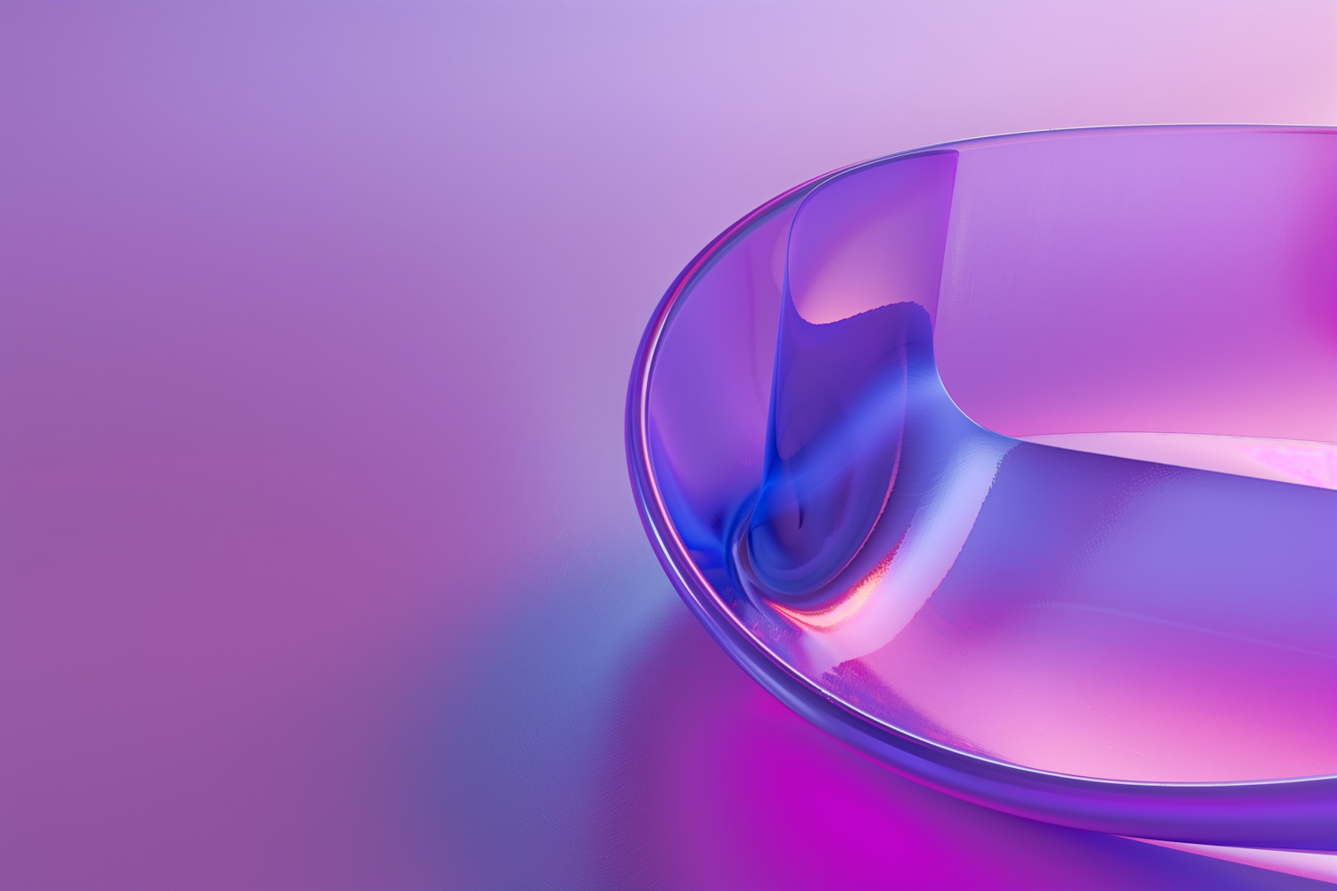 Abstract design with a curved glass-like object in vibrant purples, pinks, and blues, reflecting light on a soft gradient background.