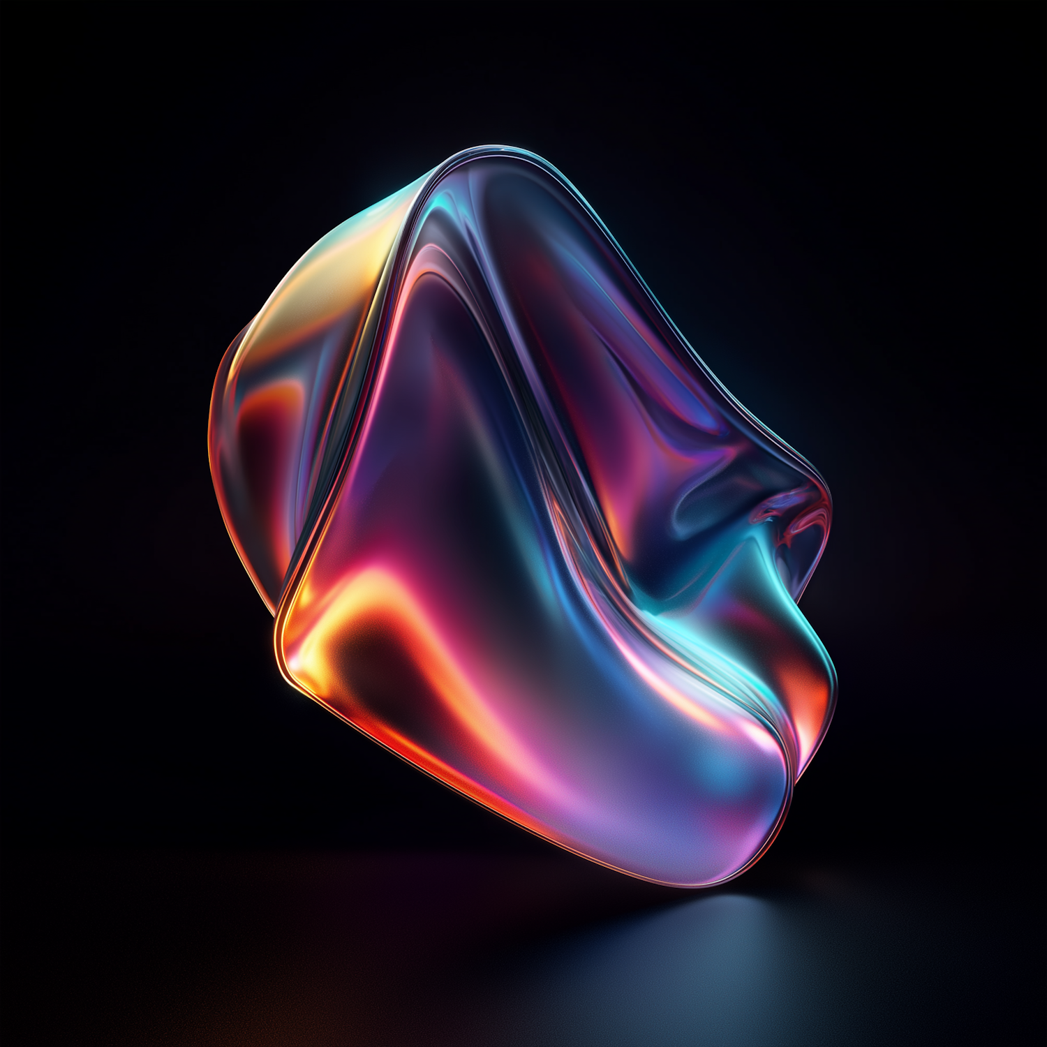 A glowing, fluid-like 3D abstract shape with vibrant pink, orange, and blue hues, floating against a dark background.