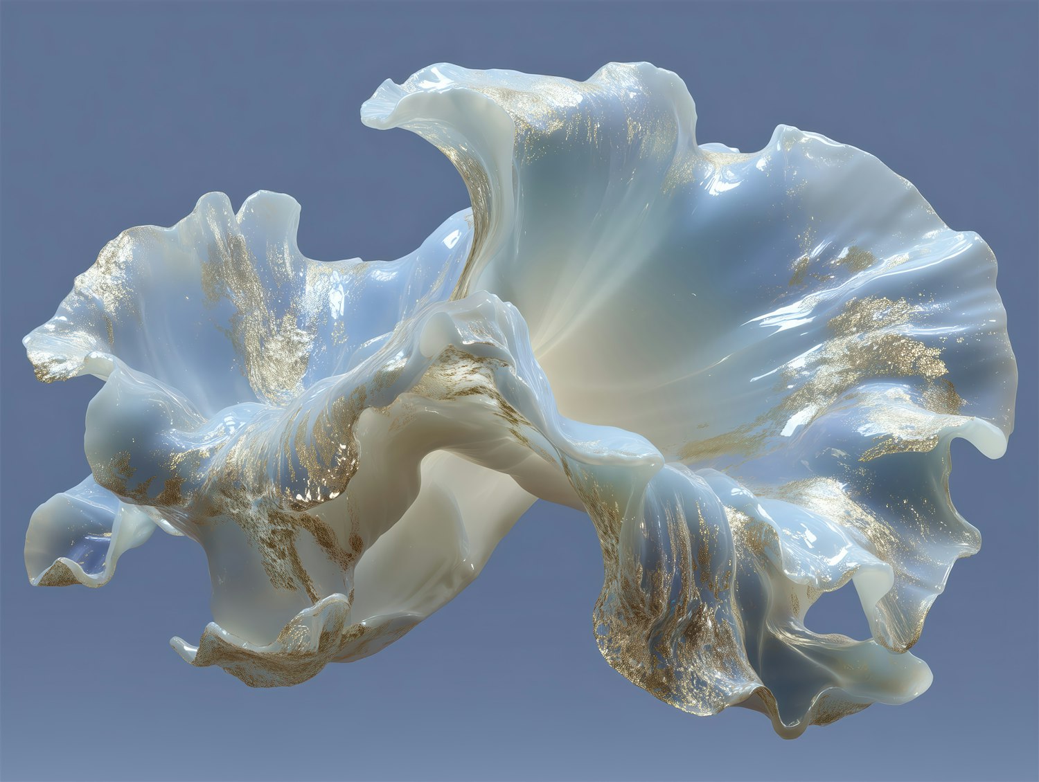 A stunning abstract sculpture with flowing, translucent curves in white and blue, accented by gold, set against a soft blue background.