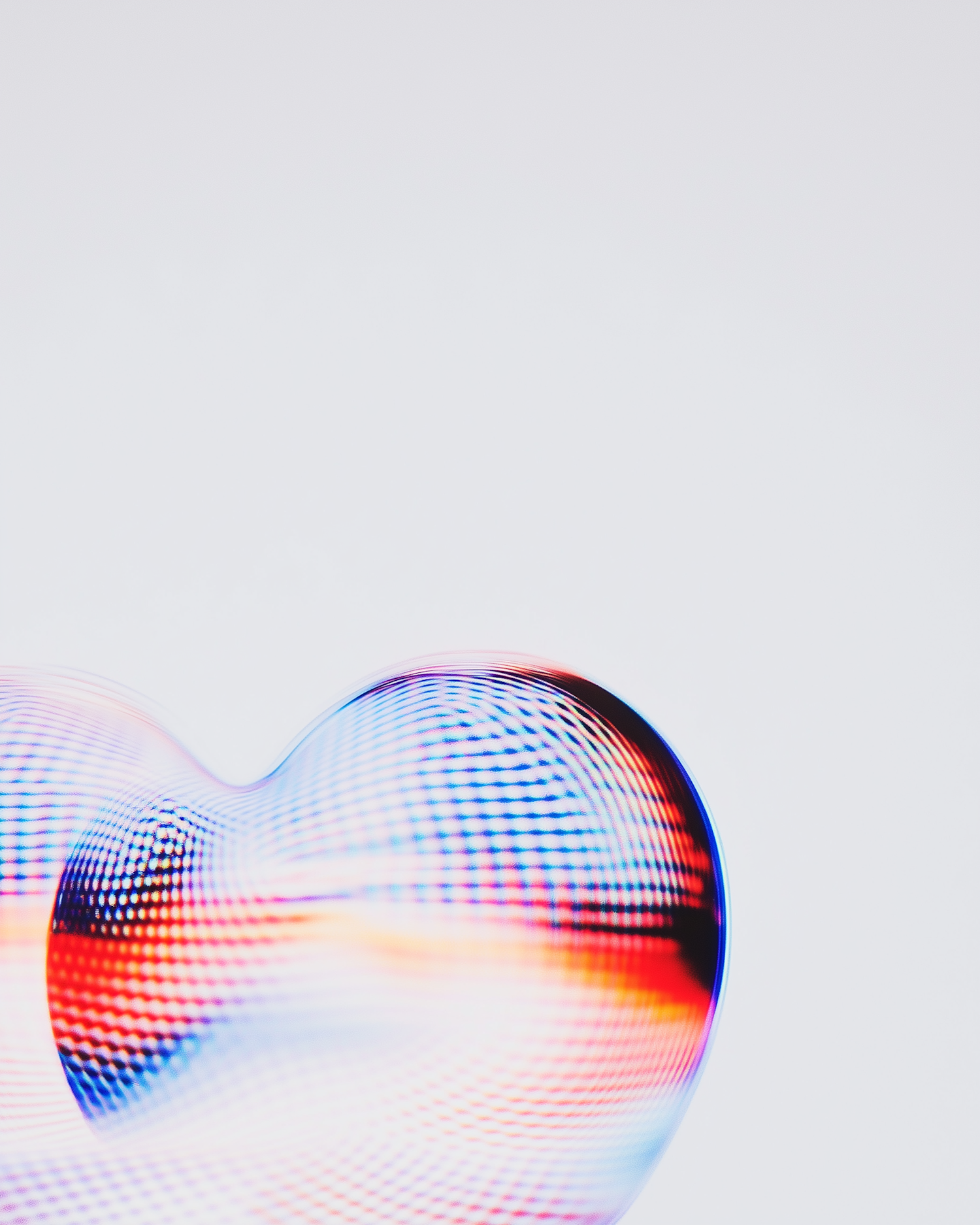 Abstract close-up of a colorful, pixelated shape with red, blue, and white hues on a neutral background.