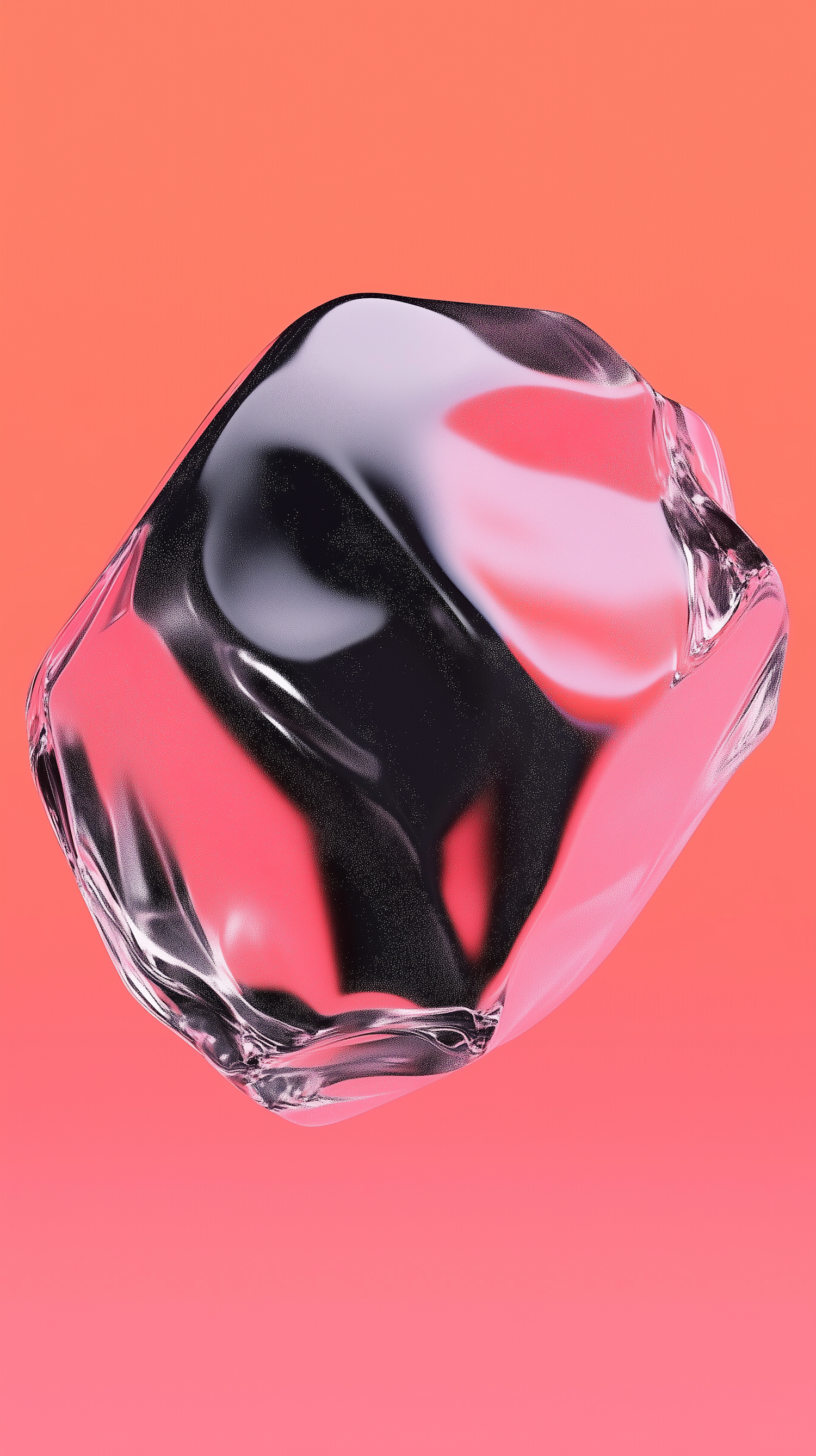 Abstract 3D glass-like object with light reflections on a coral pink gradient background. Minimalist and modern design.