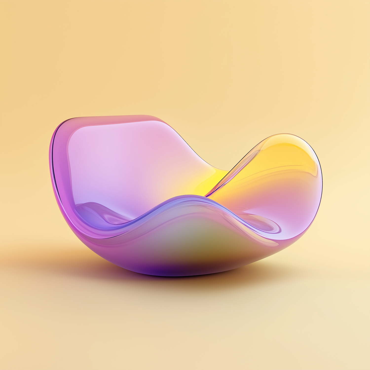 A futuristic translucent chair with a purple-to-yellow gradient on a soft yellow background, blending modern design with vibrant colors.