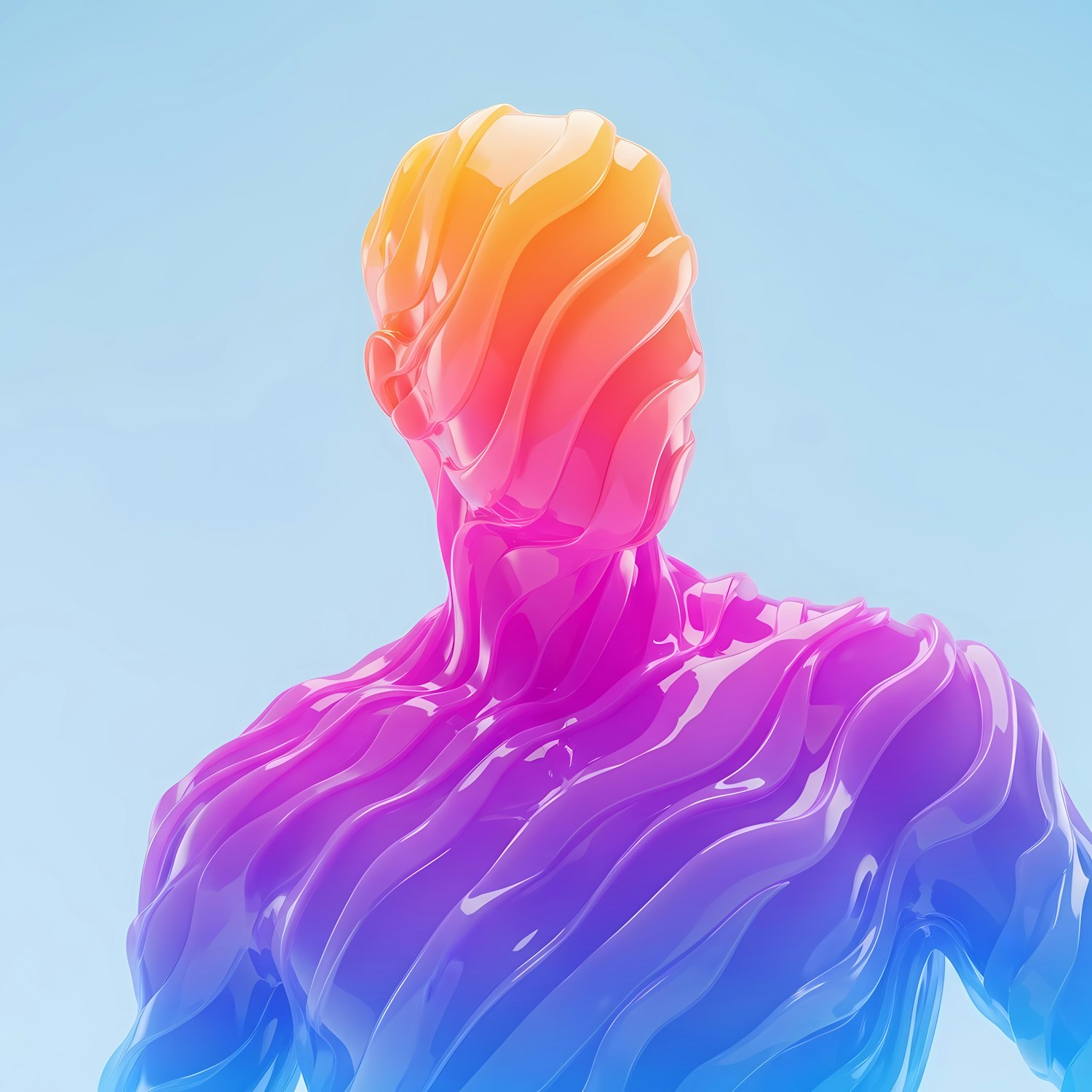 Colorful 3D humanoid figure with flowing textures and a gradient of orange, pink, and purple hues against a light blue background.