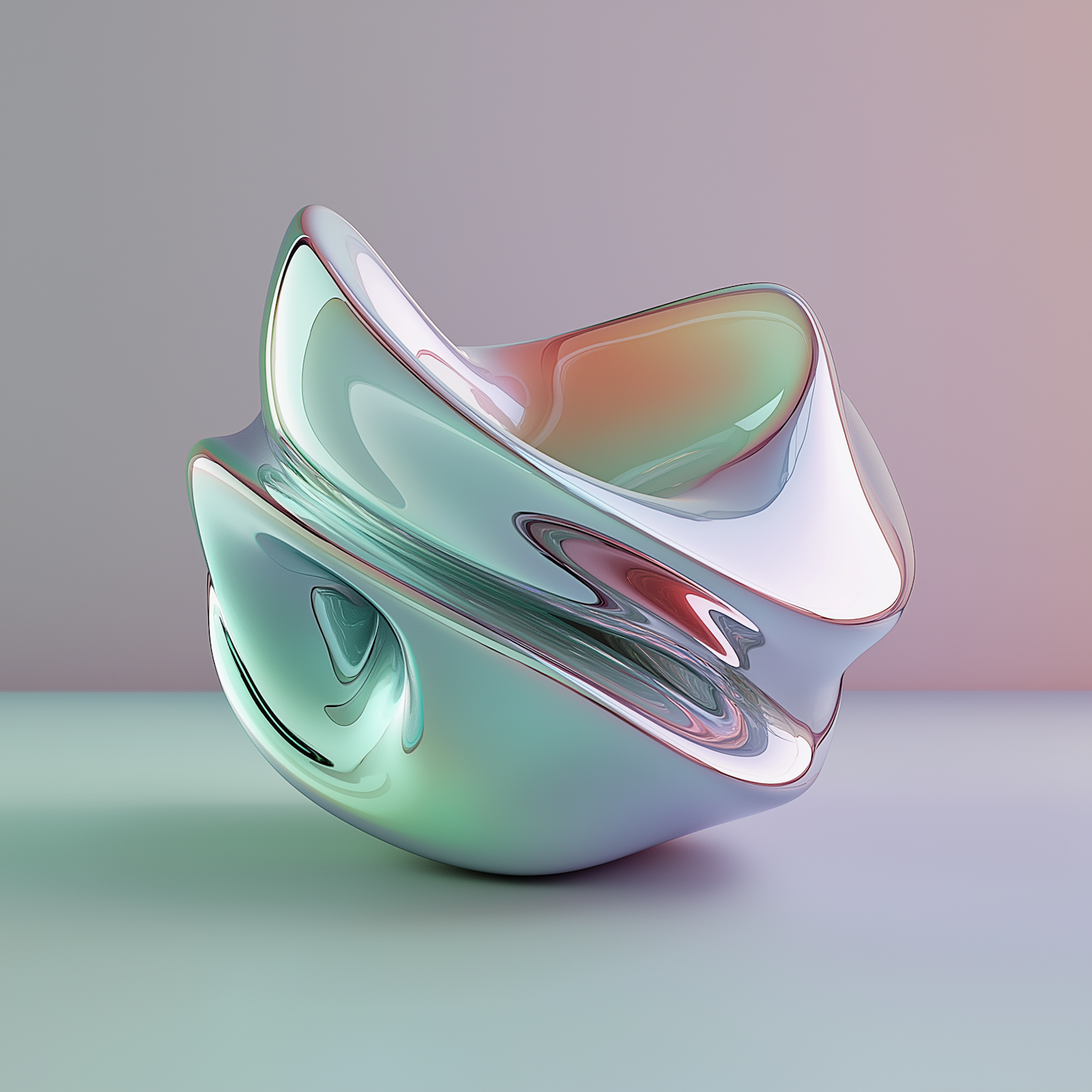 Abstract 3D sculpture with metallic sheen and fluid curves, reflecting green, pink, and silver hues against a soft gradient background.