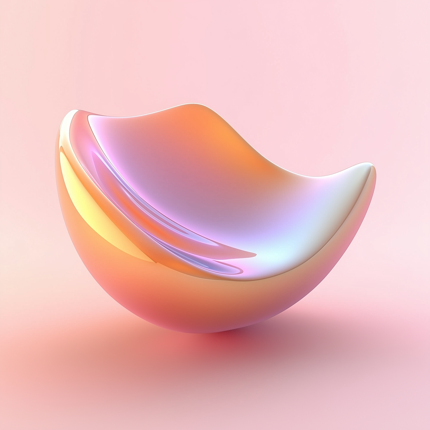 A glossy, iridescent 3D object with a gradient of orange, pink, and purple hues, set against a soft pink background.