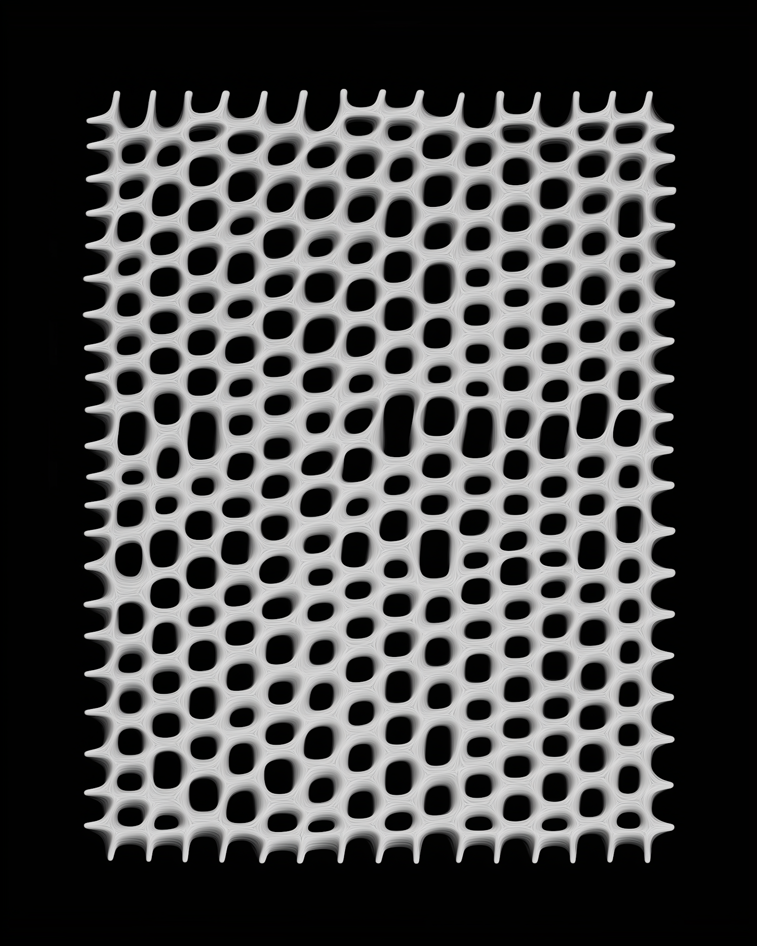 Intricate 3D lattice structure with white strands forming a grid pattern against a black background, resembling a cellular structure.