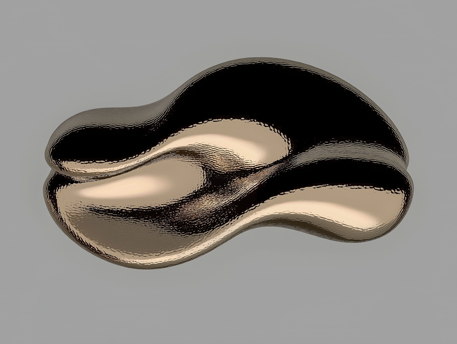 Abstract metallic object with a glossy, gold-like finish and fluid shape against a neutral gray background.